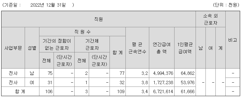 | 사업부문 | 성별 | 직원수 | 평균근속연수 | 평균연봉(백만) |