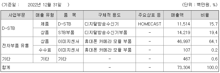 당사는 셋톱박스 개발 및 제조, 판매와 전자부품(이미지 센서 등) 유통, 차량용 블랙박스 판매 사업을 영위하고 있으며,