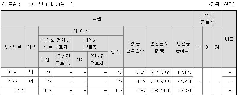 | 사업부문 | 성별 | 직원수 | 평균근속연수 | 평균연봉(백만) |