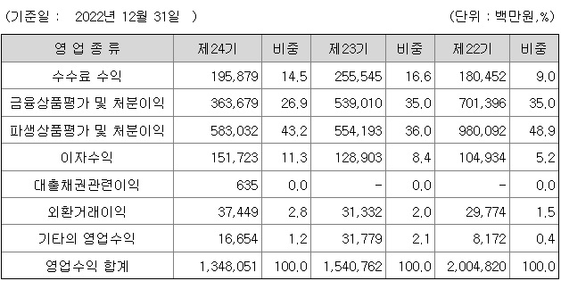 2022회계연도는 글로벌 증시 침체와 연말 부동산PF 시장의 악화로 증권업 실적이 전반적으로 악화된 한해였습니다. 당사도 부동산PF 시장 악화와 비경상적 손실등에 따른 영향으로 수익지표가 모두 감소하였습니다.