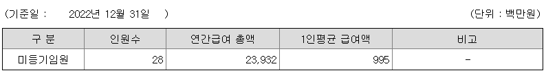 미등기임원의 평균연봉은 9억 9500만원이고 직원수는 28명입니다.