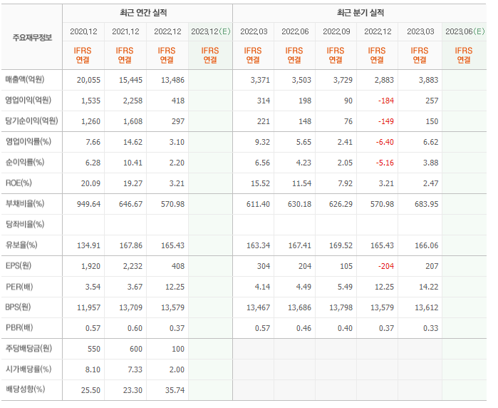 2022년말 현재 당사의 자산총계는 개별 재무제표 기준으로 6조 1,635억원으로 전년 대비 10.9% 감소하였으며, 자기자본은 9,196억원으로 전년 대비 0.96% 감소하였습니다. 2022년도의 영업이익은 개별 재무제표 기준으로 전년 대비 81.5% 감소한 416억원, 당기순이익은 전년 대비 81.5% 감소한 296억원을 기록하였습니다. 수익성 지표인 ROE는 3.22%로 전년 대비 14.1%pt 감소하였습니다.
