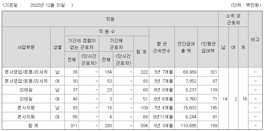 | 본사영업/운용/리서치 | 남 | 222 | 3년 7개월 | 321 |