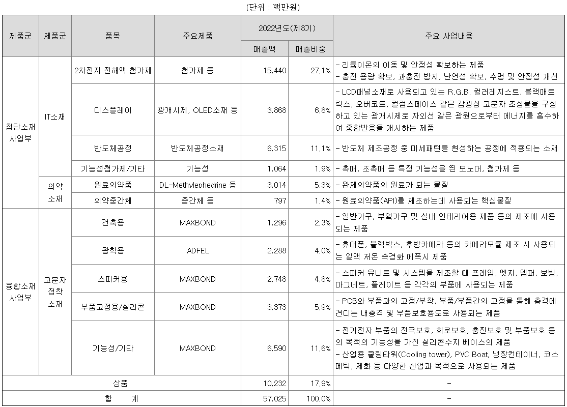 당사는 2006년 03월 설립 후 2017년 09월 케이프이에스 기업인수목적회사와의 합병을 통해 2017년 10월 코스닥증권시장에 상장하였습니다. 당사는 크게 첨단소재사업부와 융합소재사업부로 구성되어 있으며, 2차전지전해액첨가제, 반도체공정,디스플레이, OLED, 의약품 및 산업용 특수 접착 소재의 제조 및 판매를 주요 사업으로 영위하고 있습니다.