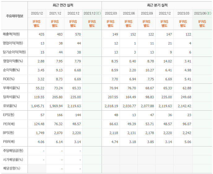 2022년 매출은 570억, 영업이익은 44억, 당기순이익은 38억입니다. 그리고 영업이익률은 7.79%입니다.