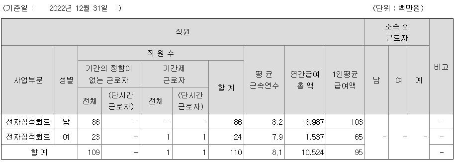 | 사업부문 | 성별 | 직원수 | 평균근속연수 | 평균연봉(백만) |
