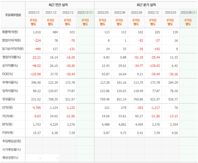2022년 매출은 433억, 영업이익은 -70억, 당기순이익은 -131억입니다. 그리고 영업이익률은 -16.20%입니다.