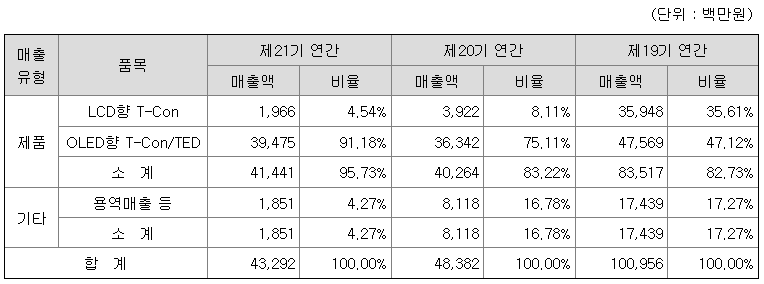 당사의 주력제품인 T-Con(Timing Controller) 및 TED(TCON Embedded Driver) IC는 디스플레이 패널을 제조하는 데 있어서 핵심 시스템 반도체에 해당합니다.