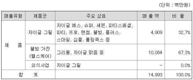 당사는 "웰빙 주방, 건강 헬스케어, 의료기기 등 앞선 기술과 아이디어 제품으로 고객의 건강한 생활의 동반자, 자이글"이라는 슬로건 아래, 웰빙 헬스케어 제품을 개발, 제조, 판매, 수출을 주요사업으로 하고 있습니다.