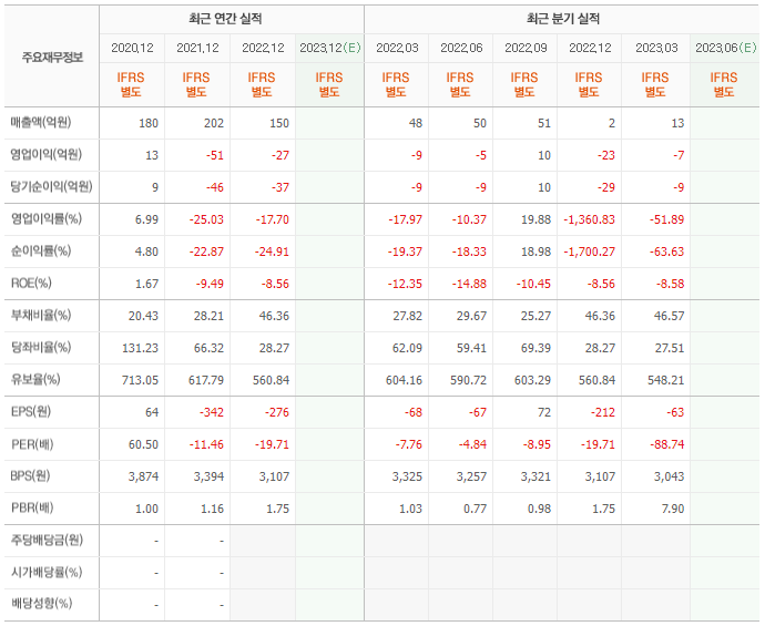 2022년 매출은 150억, 영업이익은 -27억, 당기순이익은 -37억입니다. 그리고 영업이익률은 -17.70%입니다.