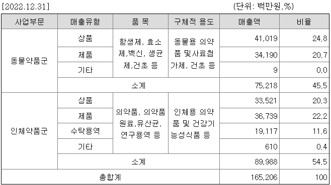당사 및 주요종속회사는 크게 동물약품, 인체약품의 사업영역으로 구성되어 있으며, 각각의 시스템이 유기적이고 효율적으로 운영되고 있습니다.