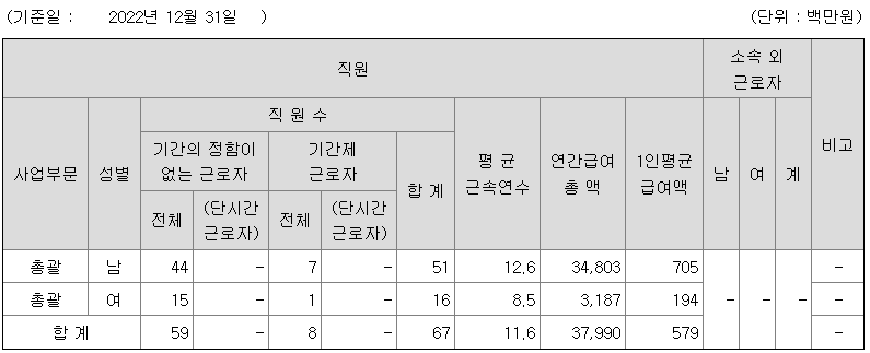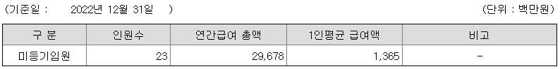 미등기임원의 평균연봉은 13억 6500만원이고 직원수는 23명입니다.