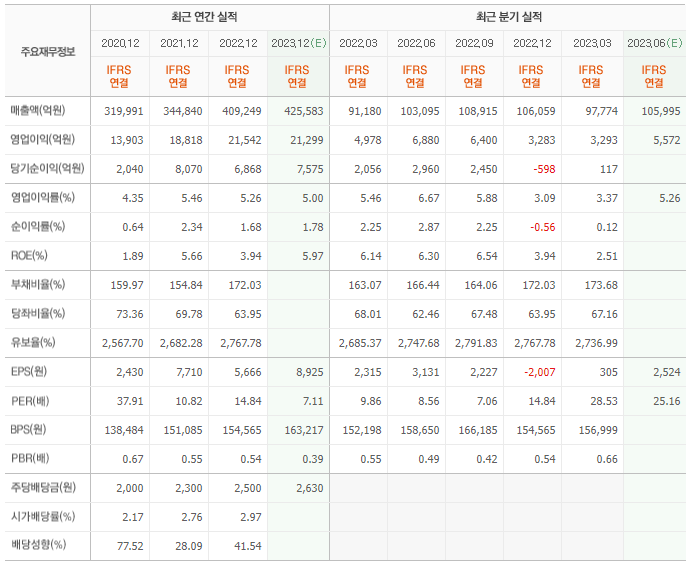 2022년 실적은 40조 9249억, 영업이익은 2조 1542억입니다. 그리고 영업이익률은 5.26%입니다.