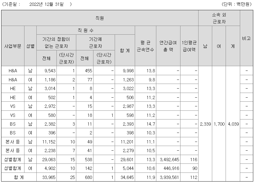 사업부문 성별 직원수 평균근속연수 평균연봉(백만)