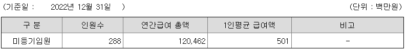 미등기임원의 평균연봉은 5억 100만원이고 직원수는 288명입니다.