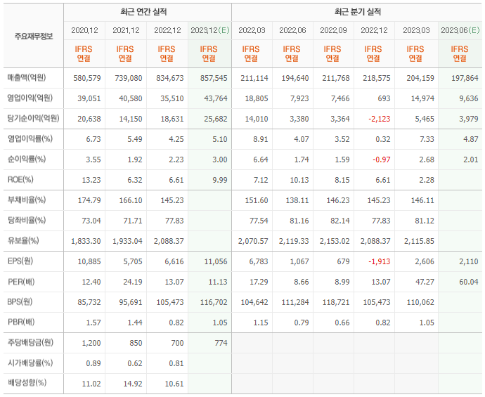 2022년 실적은 83조 4673억, 영업이익은 3조 5510억입니다. 그리고 영업이익률은 4.25%입니다.
