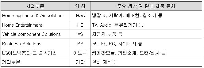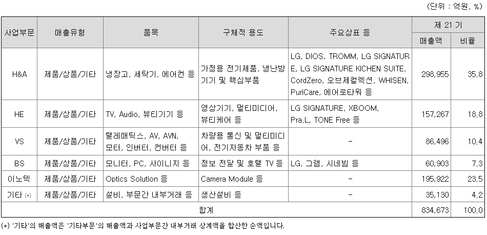 연결회사의 보고부문인 사업본부는 서로 다른 제품과 용역을 제공하는 전략적 사업단위입니다. 각 사업은 서로 다른 기술과 마케팅전략에 따라 별도로 운영되고 있습니다. 보고기간말 현재 제조 및 판매하고 있는 각 사업부문별 주요 제품은 다음과 같습니다.