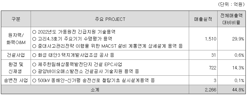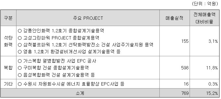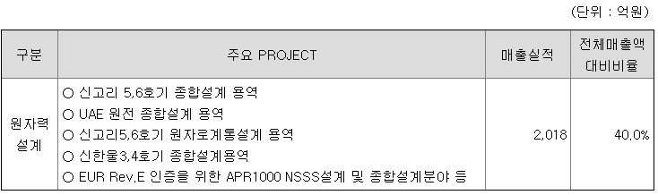 ○ 회사의 사업부문은 사업영역에 따라 원자력, 에너지신사업, 원자로로 분류하였습니다. 원자력은 원전 종합설계(Architect Engineering)를 원자로는 원자로계통설계(Nuclear Steam Supply System)에 해당하는 사업을 일컬으며, 에너지신사업의 경우 화력(복합화력 포함), 신재생에너지, 친환경에너지사업 등 비원전사업에 해당됩니다.