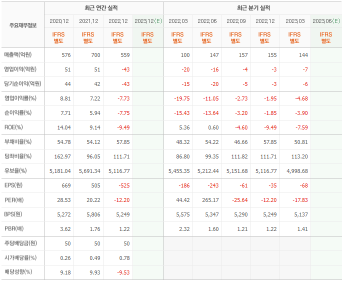 2022년 매출은 559억, 영업이익은 -43억, 당기순이익은 -43억입니다. 그리고 영업이익률은 -7.73%입니다.