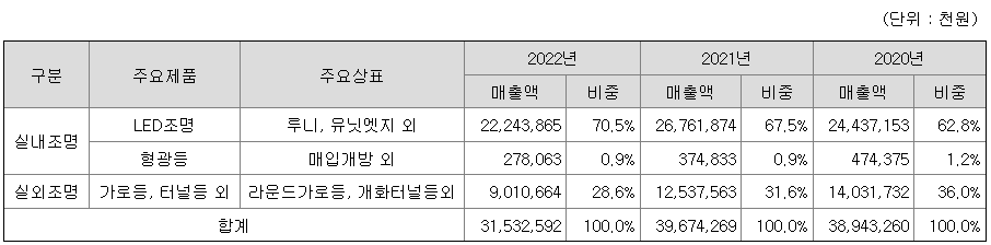 당사의 조명기구를 제조하는 업체로서, 주력제품은 ① LED등, ② 형광등, ③ 실외등(가로등/터널등)입니다.