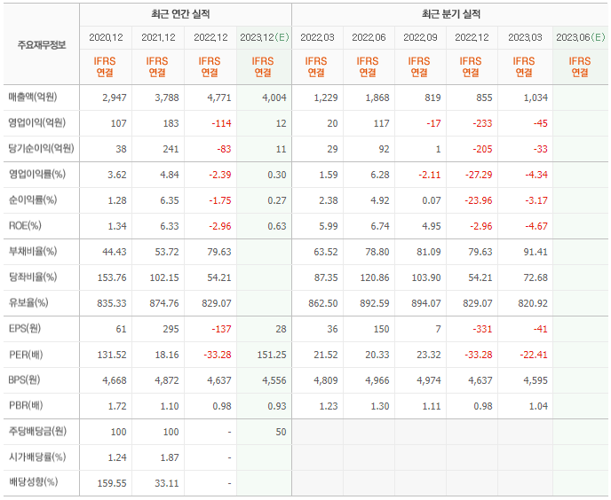 2022년 매출은 4771억, 영업이익은 -114억, 당기순이익은 -83억입니다. 그리고 영업이익률은 -2.39%입니다.