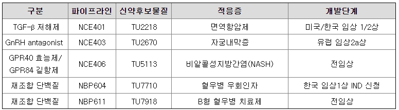 앞서 서술한 바와 같이 당사는 저분자 합성신약과 유전자 재조합 바이오신약의 연구개발 및 사업화를 목표로 혁신 신약 연구개발을 수행하고 있는 회사로서, 당사의 신약 창출 시스템을 통해 저분자 합성신약으로서 NCE401, NCE403 프로그램과 바이오신약으로서 NBP604 등의 프로그램을 연구 개발 중에 있으며, 각 프로그램의 개요는 다음과 같습니다.