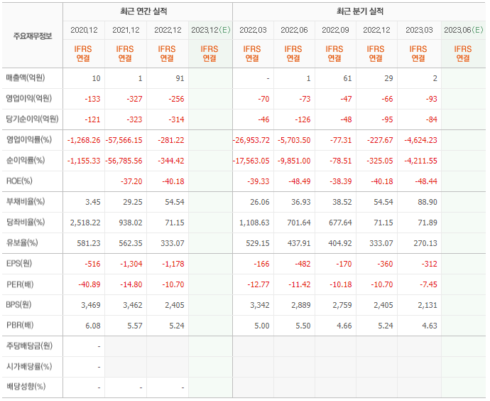 2022년 매출은 91억, 영업이익은 -256억, 당기순이익은 -314억입니다. 그리고 영업이익률은 -281.22%입니다.