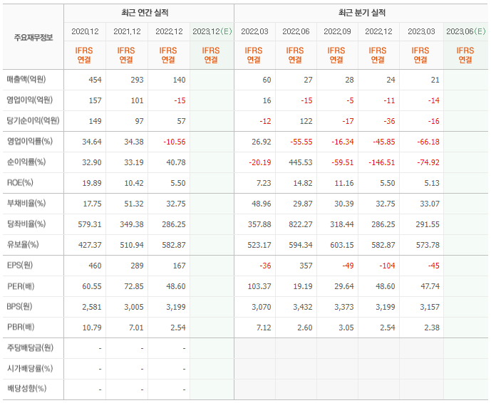 2022년 매출은 140억, 영업이익은 -15억, 당기순이익은 57억입니다. 그리고 영업이익률은 -10.56%입니다.
