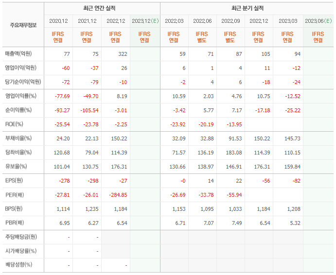 2022년 매출은 322억, 영업이익은 26억, 당기순이익은 -10억입니다. 그리고 영업이익률은 8.19%입니다.