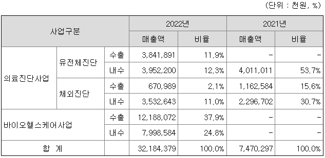 당사의 사업은 크게 의료진단사업과 바이오헬스케어사업으로 구분할 수 있으며, 2022년 매출은 의료진단사업이 119억9,723만원(37.3%), 바이오헬스케어사업이 201억8,665만원(62.7%)를 차지하고 있습니다.