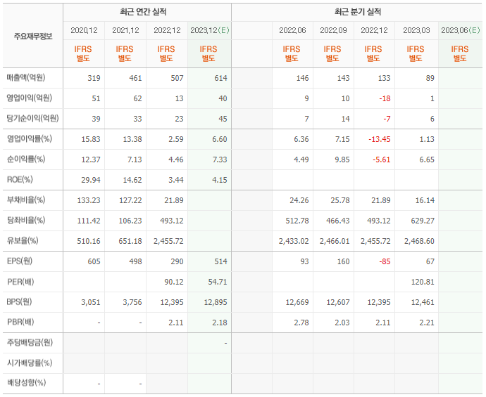 2022년 매출은 507억, 영업이익은 13억, 당기순이익은 23억입니다. 그리고 영업이익률은 2.59%입니다.