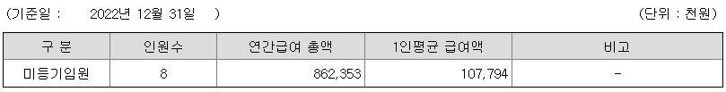 미등기임원의 평균연봉은 1억 700만원이고 직원수는 8명입니다.