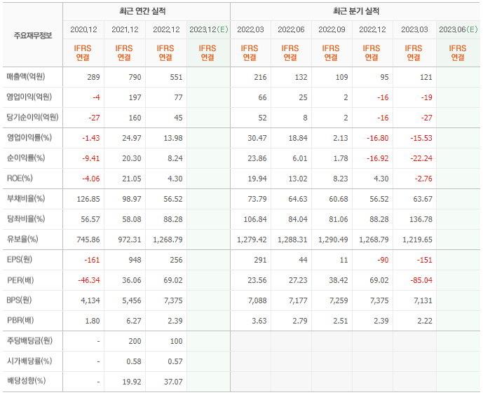 2022년 매출은 551억, 영업이익은 77억, 당기순이익은 45억입니다. 그리고 영업이익률은 13.98%입니다.