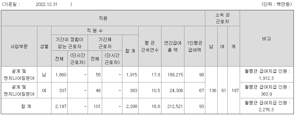 | 사업부문 | 성별 | 직원수 | 평균근속연수 | 평균연봉(백만) |