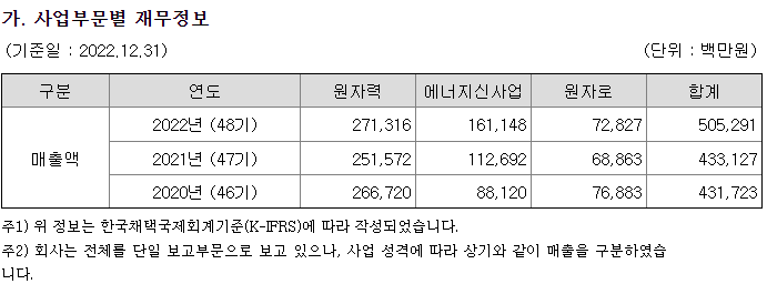 ○ 회사의 사업부문은 사업영역에 따라 원자력, 에너지신사업, 원자로로 분류하였습니다. 원자력은 원전 종합설계(Architect Engineering)를 원자로는 원자로계통설계(Nuclear Steam Supply System)에 해당하는 사업을 일컬으며, 에너지신사업의 경우 화력(복합화력 포함), 신재생에너지, 친환경에너지사업 등 비원전사업에 해당됩니다.