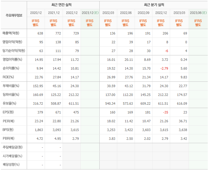 2022년 매출은 729억, 영업이익은 85억, 당기순이익은 79억입니다. 그리고 영업이익률은 11.72%입니다.