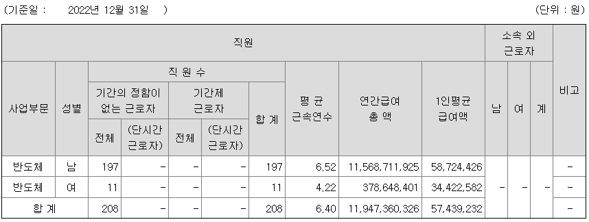 | 사업부문 | 성별 | 직원수 | 평균근속연수 | 평균연봉(백만) |
