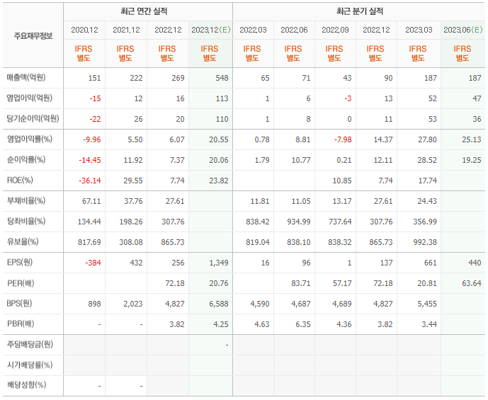 2022년 매출은 269억, 영업이익은 16억, 당기순이익은 20억입니다. 그리고 영업이익률은 6.07%입니다.