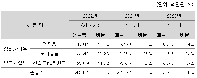 당사는 카메라 모듈 관련 자동화장비 전문 기업으로서 자동차 전장용 카메라 조립 및 검사장비를 개발 판매하는 장비 사업부와, 자동화 공정 장비용 핵심 부품을 개발 판매하는 부품사업부로 구성되어 사업 영위하고 있습니다.