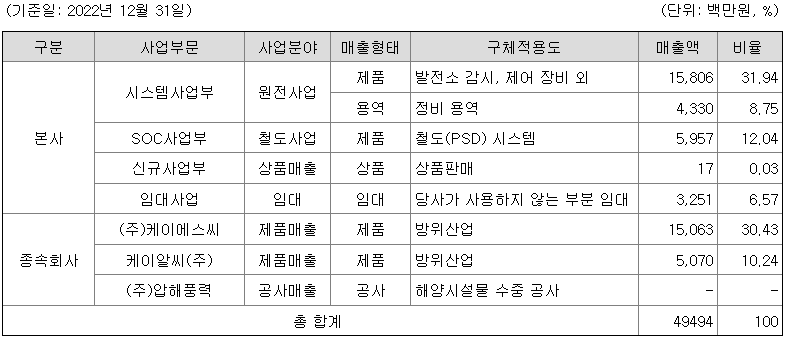 당사의 시스템사업부문은 30년간 원자력발전소 감시제어 시스템을 자체기술로 개발하여 공급함으로써 한국형 원자력발전소 설계에 최적화된 사양과 성능을 제공하고 품질을 보증해 왔으며 대한민국 원전기술 발전에도 큰 역할을 하고 있습니다. 이러한 원전 감시제어 시스템 개발 및 공급 경험은 유/무선 네트워크 기술, 디지털신호처리(DSP) 기술, Real-time OS 관련기술, 데이터베이스 처리기술 등의 첨단 원천기술을 확보할 수 있는 기회가 되었고 이러한 기술을 활용한 국내외 관련 산업계 진출의 기반이 되고 있습니다.