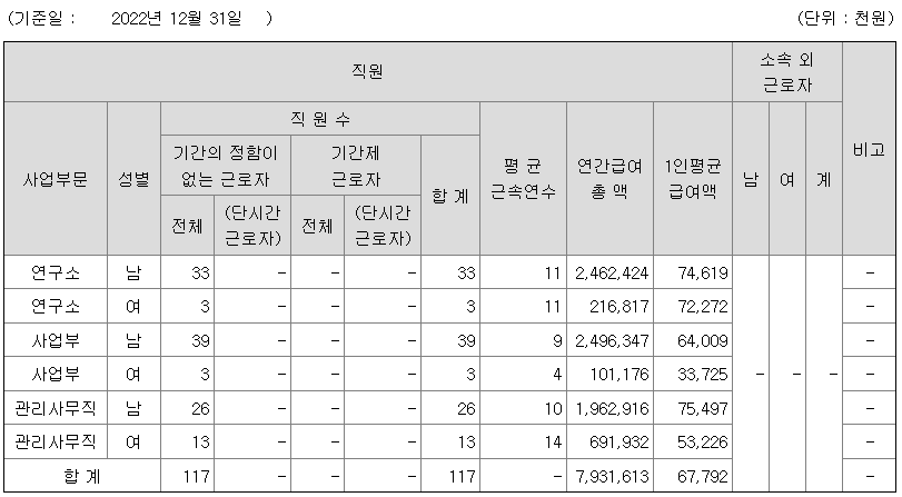 | 사업부문 | 성별 | 직원수 | 평균근속연수 | 평균연봉(백만) |