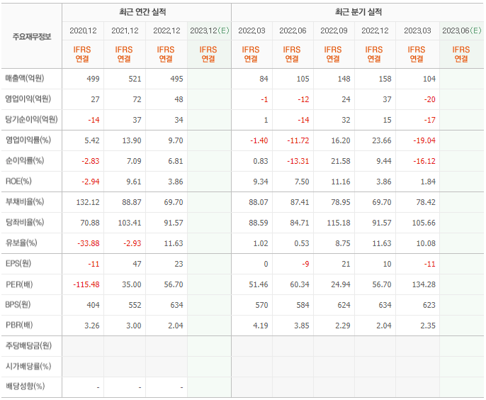 2022년 매출은 495억, 영업이익은 48억, 당기순이익은 34억입니다. 그리고 영업이익률은 9.70%입니다.