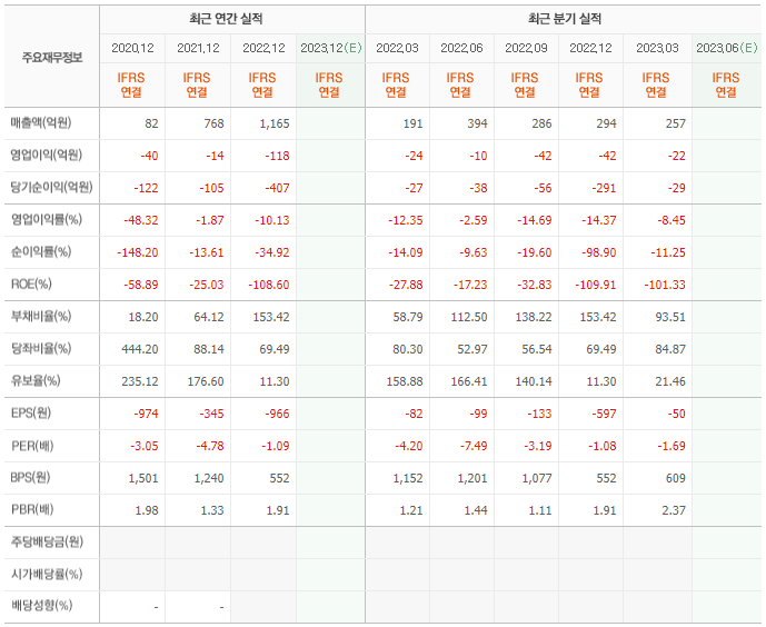 2022년 매출은 1165억, 영업이익은 -118억, 당기순이익은 -407억입니다. 그리고 영업이익률은 -10.13%입니다.