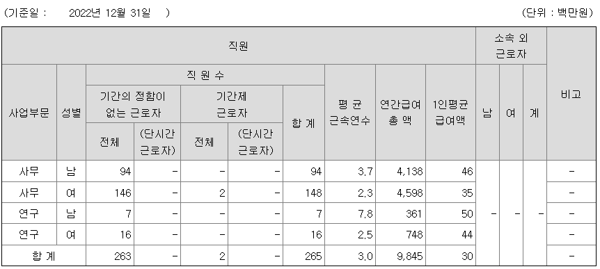 | 사업부문 | 성별 | 직원수 | 평균근속연수 | 평균연봉(백만) |