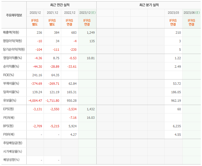 2022년 매출은 683억, 영업이익은 -4억, 당기순이익은 -230억입니다. 그리고 영업이익률은 -0.53%입니다.