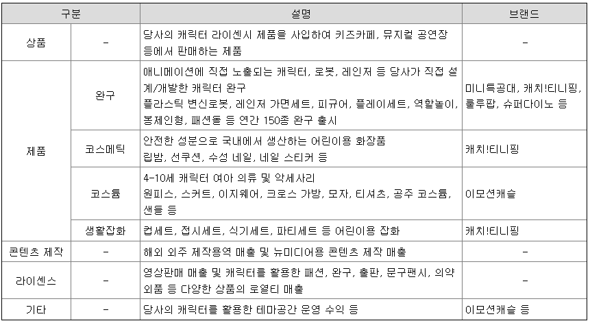 자체 캐릭터와 브랜드의 키즈 콘텐츠를 기획 제작하여 인터넷 동영상 서비스(유튜브,iQiyi, YOUKU 등), OTT, IPTV 등 다양한 플랫폼에서 자체 채널을 운영하며, 해당 캐릭터와 브랜드를 활용한 완구-의류-화장품 등 머천다이징(MD), 교육, 게임 등으로 사업을 확장시켜 왔습니다. 이러한 사업구조는 한국 시장에서 완성되어 중국 시장으로 확대되었으며, 동남아, 남미, 유럽 등 해외 시장에서도 꾸준한 증가 추세를 보이고 있습니다.