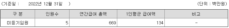 미등기임원의 평균연봉은 1억 3400만원이고 직원수는 5명입니다.