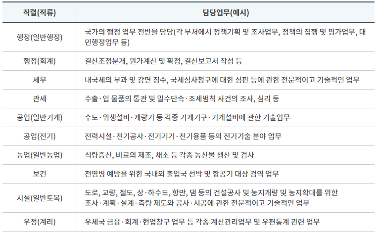 ※ 공무원 직렬(직류)은 예시로 나와있는 행정, 세무, 관세 등 이외에도 다른 직렬(직류)들이 있으니 자세한 내용은 공무원임용시험령 및 시험공고문을 확인하시기 바랍니다.