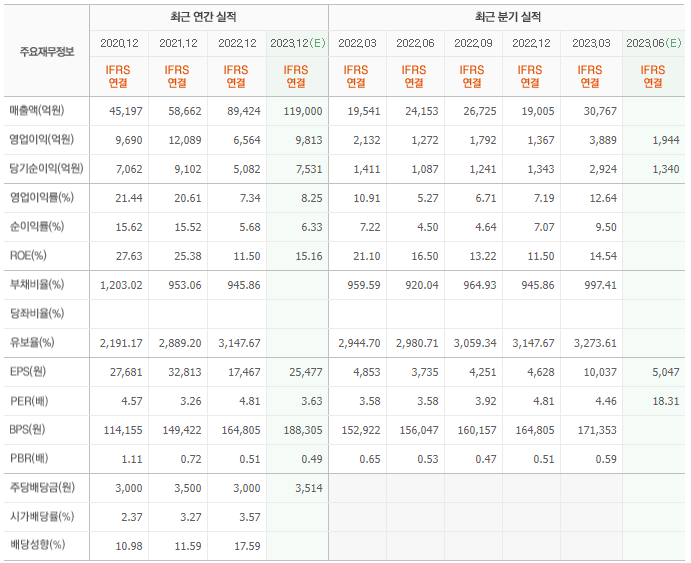 2022년 실적은 8조 9424억, 영업이익은 6564억입니다. 그리고 영업이익률은 7.34%입니다.