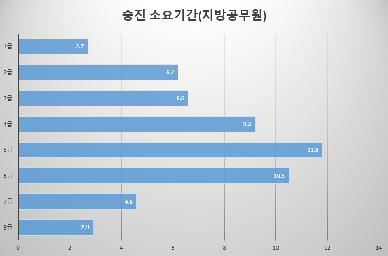 지방공무원의 평균승진 소요 기간은 9급에서 8급은 2년 9개월, 8급에서 7급은 4년 6개월, 7급에서 6급은 10년 5개월, 6급에서 5급은 11년 8개월, 5급에서 4급은 9년 2개월. 4급에서 3급은 6년 6개월, 3급에서 2급은 6년 2개월, 2급에서 1급은 2년 7개월이 평균적으로 소요되었습니다.